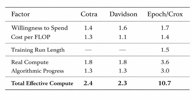 Cotra and Davidson were pretty close on willingness to spend and on FLOPs/$. This is an impressive achievement; they more or less predicted the giant data center buildout of the past few years. They ignored training run length, which probably seemed like a reasonable simplification at the time. But they got killed on algorithmic progress, which was 200% per year instead of 30%. How did they get this one so wrong?